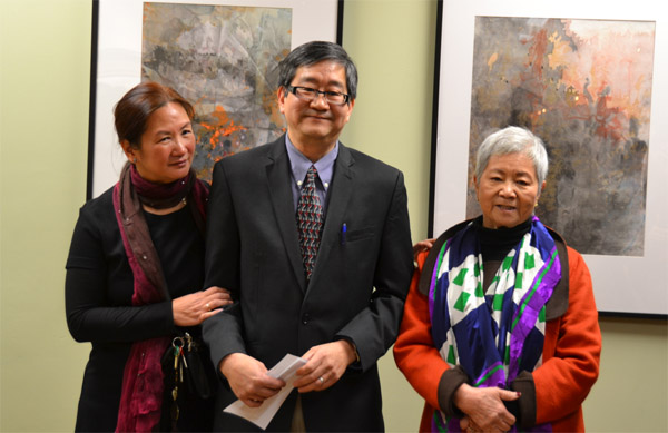 艺术之家,著名画家华之寧(右)与馆长王元路(中)、儿媳陈鸣兰(左)与在画展开幕式上