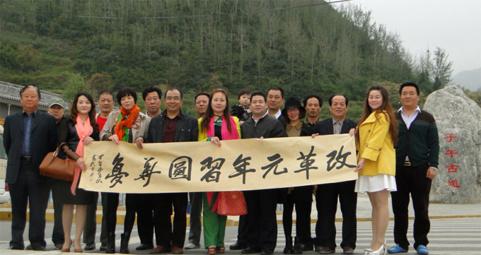 登上“2014新長城中國文化榜”的劉吉墩(左七)大師聯眾在長安子午古道展示“改革元年習圓華夢”系列書畫圖景。 張百慶 攝