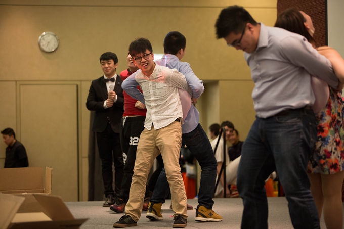 而后晚会进入了中场互动游戏环节,这番互动游戏由三部分组成:抢椅子、猜歌、甩红包,游戏的奖品是现在最流行的童年零食辣条,台下观众们争先恐后地上台互动,游戏非常精彩有趣,也是给晚会推向了一个高潮!其中最为观众带来笑声连连的是“猜歌”的游戏,猜歌者不仅要猜对歌,还要两两一组夹破气球,同学们卖力的笨拙样子也是萌倒了一片。