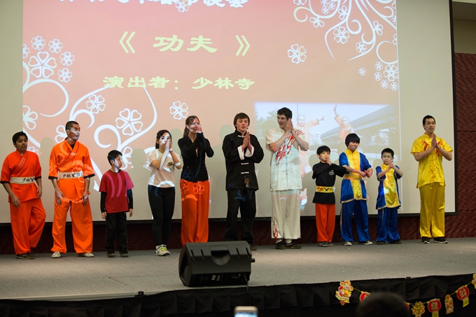 清新过后便是激昂的武术表演,由芝加哥少林寺带来的《少林功夫》真不愧是少林寺的招牌功夫演出,其中惊险的人体“断木棍”和小同学带来的醉拳表演让台下观众连连叫好。然后是晚会最后一个小品《父子三人》,一口正宗的唐山话让人直接进入了相声的世界,这小品也是确实为大家但来欢笑。