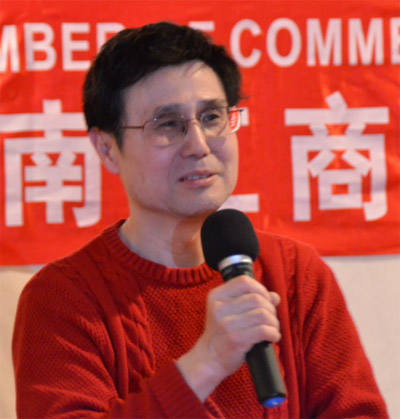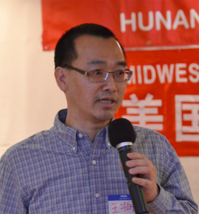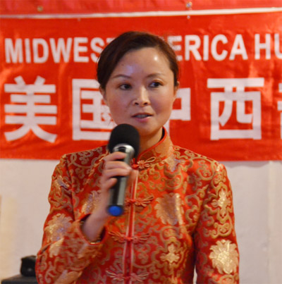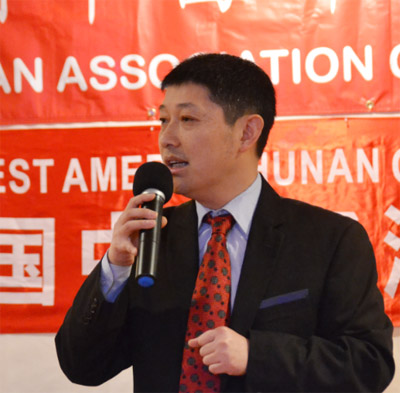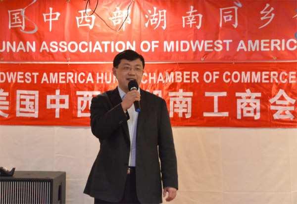 当天的活动,由朱拔立、谢傈主持,湖南同乡会会长王柏青,代表湖南同乡会暨湖南工商会全体理事,热烈欢迎老乡们、嘉宾们及各界友人人的到来。王会长在致辞中回顾了 2014 年湖南同乡会暨工商会的会务活动,包括夏日野餐联谊、 积极参加湖南省侨办及芝加哥地区总领馆和华人华侨组织的活动,特别三年多以来成功组织中国寻根之旅夏令营,广受好评。王会长特别感谢现任所有理事及荣退理事多年来的辛勤付出、无私奉献,是大家的齐心协力才把湖南同乡会办成大芝加哥地区最具活力最有生气的团体之一。去年芝加哥华人社区隆重举办庆祝建国 65 周年游行,湖南同乡会暨工商会组织乡亲登上花车游行,成为游行中人数最多、气氛最热烈的花车之一,这让大家引以为豪。