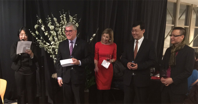 芝加哥旅游局局长Don Welsh(),芝加哥总领事馆代总领事王永(右二),晓军美食集团董事长胡晓军(右一)出席欢迎仪式