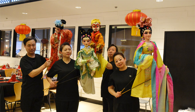 正在芝加哥访问演出的陕西皮影戏团,当天应邀前来为中国游客表演