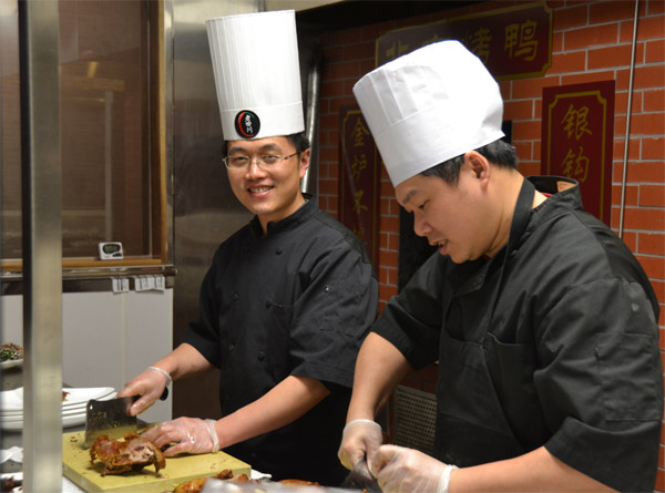 当天来自北京的游客对老四川的烤鸭特别夸赞,图为厨师们在切北京烤鸭
