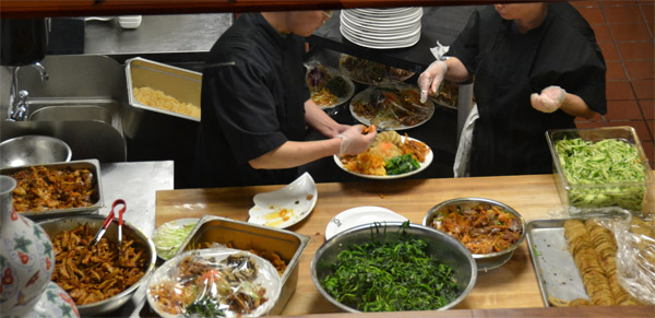 开放式厨房内,老四川员工在准备中餐美食,犒劳来自祖国的客人