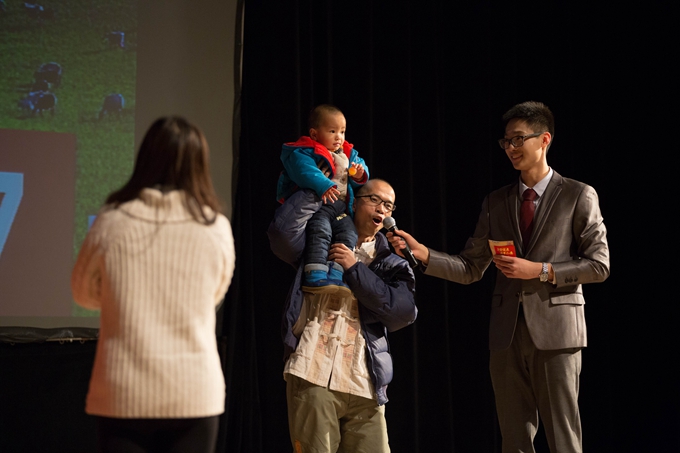 一家三口上台比划猜字谜,老爸抗着儿子不嫌辛苦