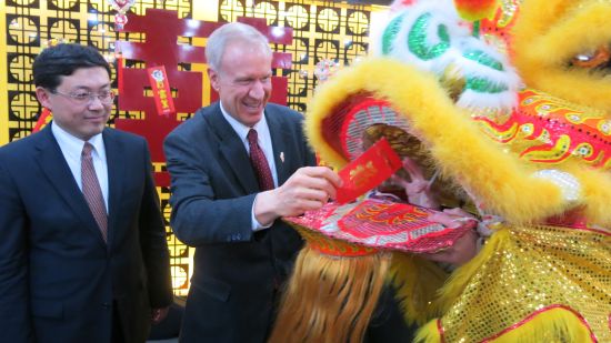 联欢活动在中国传统的醒狮表演中开始,朗纳州长、王永代总领事、华商会会长谭小平等人为醒狮送上了红包。随后,朗纳登台致辞,他用一口流利的广东话说出“恭喜发财”赢得了满堂喝彩。朗纳表示,非常高兴来到华商会与所有华裔友人共庆羊年新春。中国对他来说,是一个十分熟悉的国家。他曾跟随时任芝加哥市长的戴利前往中国考察。而且,他的弟弟娶了一位中国太太,目前还生活在上海。