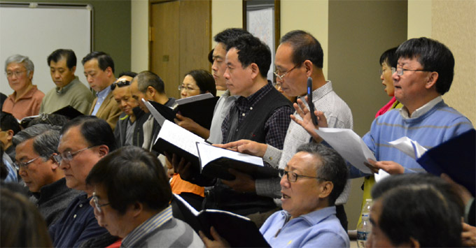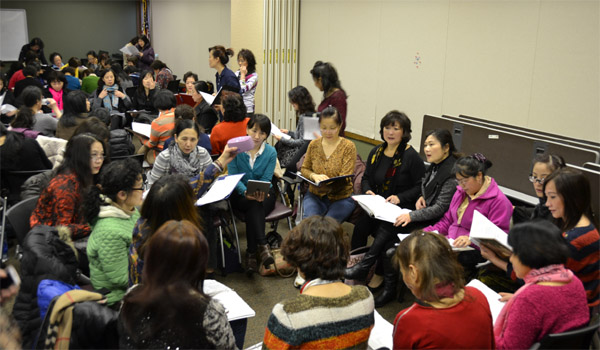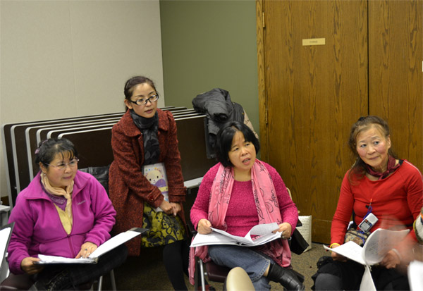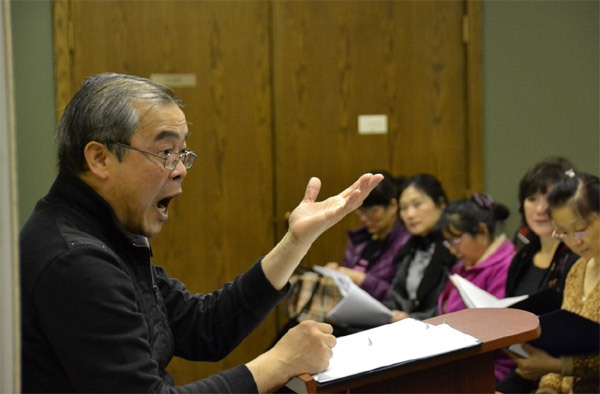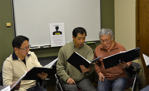 由胡大江带队的中国城合唱团成员在小组排练中