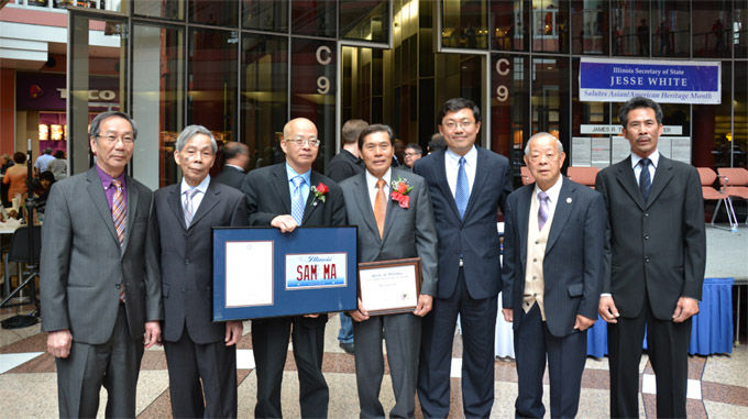 华裔社区杰出工商业主赵培业(左二)等“亚裔社区杰出人士”奖得主与州务卿Jesse White 合影