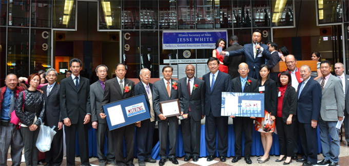 芝加哥侨学网报道】伊州州务卿杰西怀特(Jesse White)欢庆亚裔月活动,5月12日在芝加哥市中心州府大楼隆重举行。杰西怀特盛赞亚裔社区多元文化与蓬勃活力,并向杰出亚裔社区人士颁奖。芝加哥华裔社区杰出人物马森柱、张宏超荣获“杰出亚裔领袖奖”,赵培业荣获“杰出亚裔社区人士奖”。