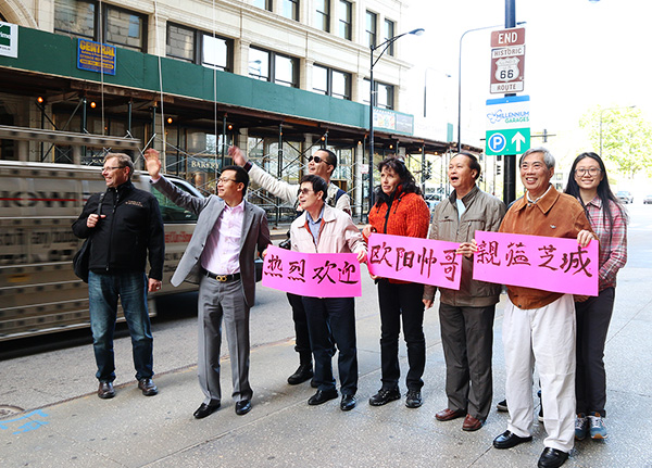 芝加哥地区著名侨领胡晓军等热情的芝加哥华人纷纷来到位于Jackson st. & Michgan ave. 的66号公路终点,前来等待与迎接欧阳同学的到来,除此之外,还有来自芝加哥大学,芝加哥艺术学院,伊利诺伊理工大学和哥伦比亚学院的同学前来为他接风洗尘。在等待欧阳到来的过程中,一些经过的路人向欢迎团队询问起来他的故事,其后也加入了欢迎的队伍,一起迎接这个激动人心的时刻。当大家远远看到欧阳同学风尘仆仆的身影时,全都兴奋不已,迫不及待地要拥抱这位勇士,胡晓军先生热情地跑上前去为欧阳提行李。