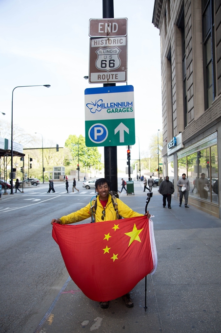 (芝加哥侨学网记者姬京璐图文报道)5月13日下午,一名叫欧阳博熠的中国留学生徒步73天后,在芝加哥完成了他的旅途。欧阳独自走完了美国66号公路,他于3月2日从起点洛杉矶发出,终于与今日抵达了终点-芝加哥密歇根大道。