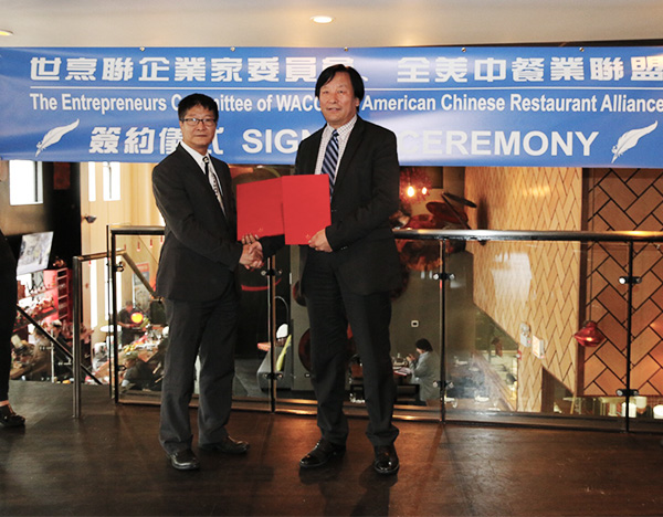【芝加哥侨学网记者姬京璐报道】世界烹饪联合会企业家委员会、全美中餐业联盟(ACRA)5月19日在芝加哥签署协议,双方将在中餐文化交流、中餐业人才国际输送、推动中餐业在美国的连锁经营等方面达成战略合作,推动海外中餐业的革新与发展。同时,世界烹饪联合会企业家委员会北美地区区域主席授权仪式也在当天举行。著名侨领、晓军美食集团董事长胡晓军,获任世界烹饪联合会企业家委员会北美地区区域主席。