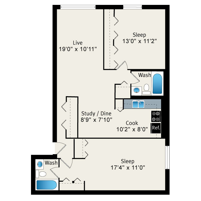 两室一厅如图,客厅距厨房有一定的距离,且有餐桌摆放的空间,所以客厅的空间稍加遮挡基本就是独立空间。