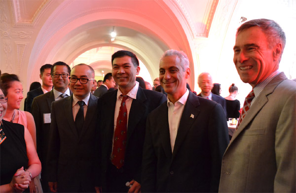 芝加哥市长伊曼纽(右二)出席筹款晚宴,并与华裔社区人士合影,右三为美国福建商业联合总会会长郑时垣
