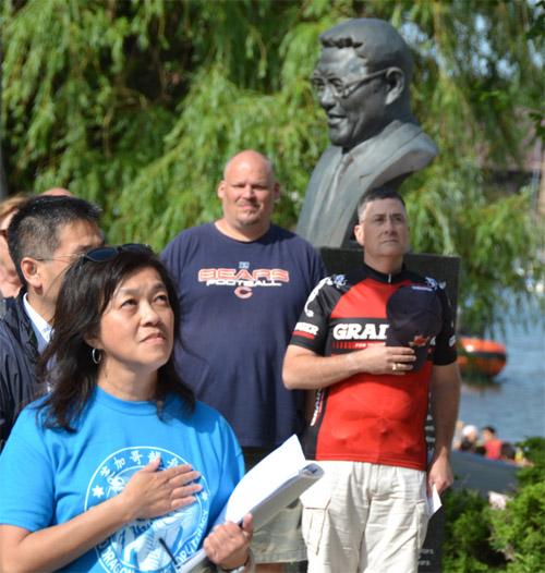 比赛在中国城谭继平公园举行,图为开幕式上唱国歌