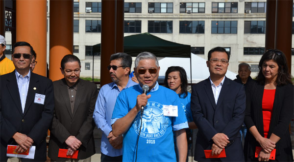 芝城华商会会长陈伟民代表主办方致辞,对各参赛队伍、各界嘉宾的到来表示热烈欢迎,并感谢各大赞助商对龙舟赛的支持。作为非牟利机构,芝城华商会每年都会把主办龙舟赛的广告、赞助经费盈余,捐赠给中国城社区的公立、私立学校,支持社区文教事业。