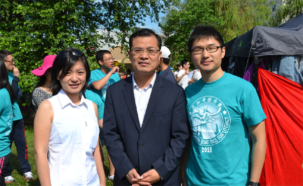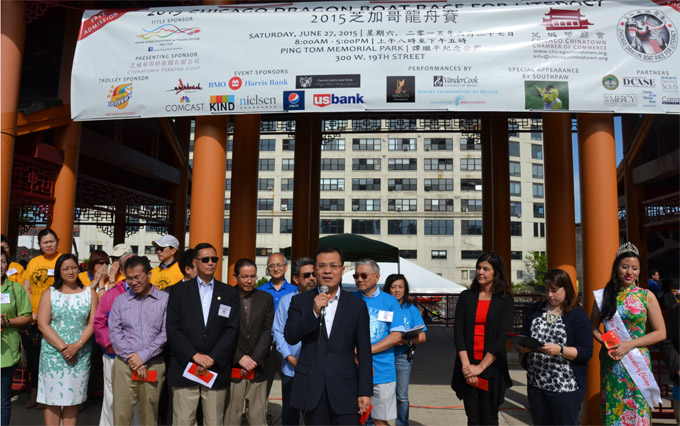 在当天开幕式上,25区区长苏礼仕高度赞扬了华商会长久以来支持华埠经济发展所做出的贡献。中国驻芝加哥总领馆赵卫平总领事则指出,龙舟赛让他充分感受到芝加哥侨界充满了生机和活力,以及华裔社区与当地其他族裔的融洽关系。赵卫平总领事高度赞扬了芝加哥华商会为华裔社区融入主流社会所发挥的纽带作用。赵卫平总领事一行,当天还特别到北京大学校友队、清华大学校友队的营地,给两支参赛华人队伍加油打气。