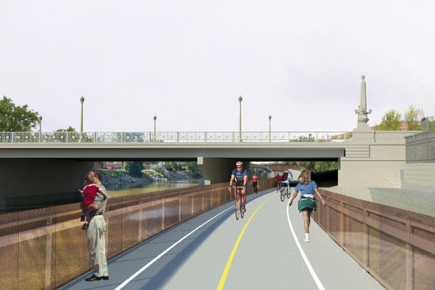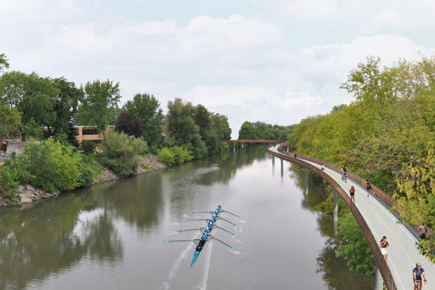 )。该休闲道,将供居民骑车、跑步、散步。该工程还包括:在爱迪生街跨河桥位置修建桥下通道,在加利福尼亚公园处,修建跨河桥,将位于芝加哥河东岸“凌波休闲小道”与对岸的公园连接起来。
