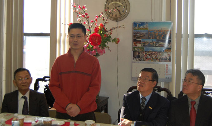 圖為駐芝加哥臺北經濟文化辦事處申佩璜處長日前拜訪至德三德公所,新屆主席周雄(左二)致歡迎辭。