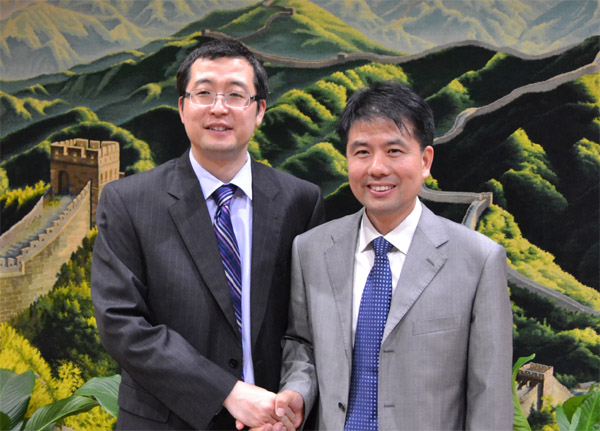 总领事馆侨务组长新旧交接,左为荣调回国的张庆新领事,右为新任侨务组长卢晓晖领事