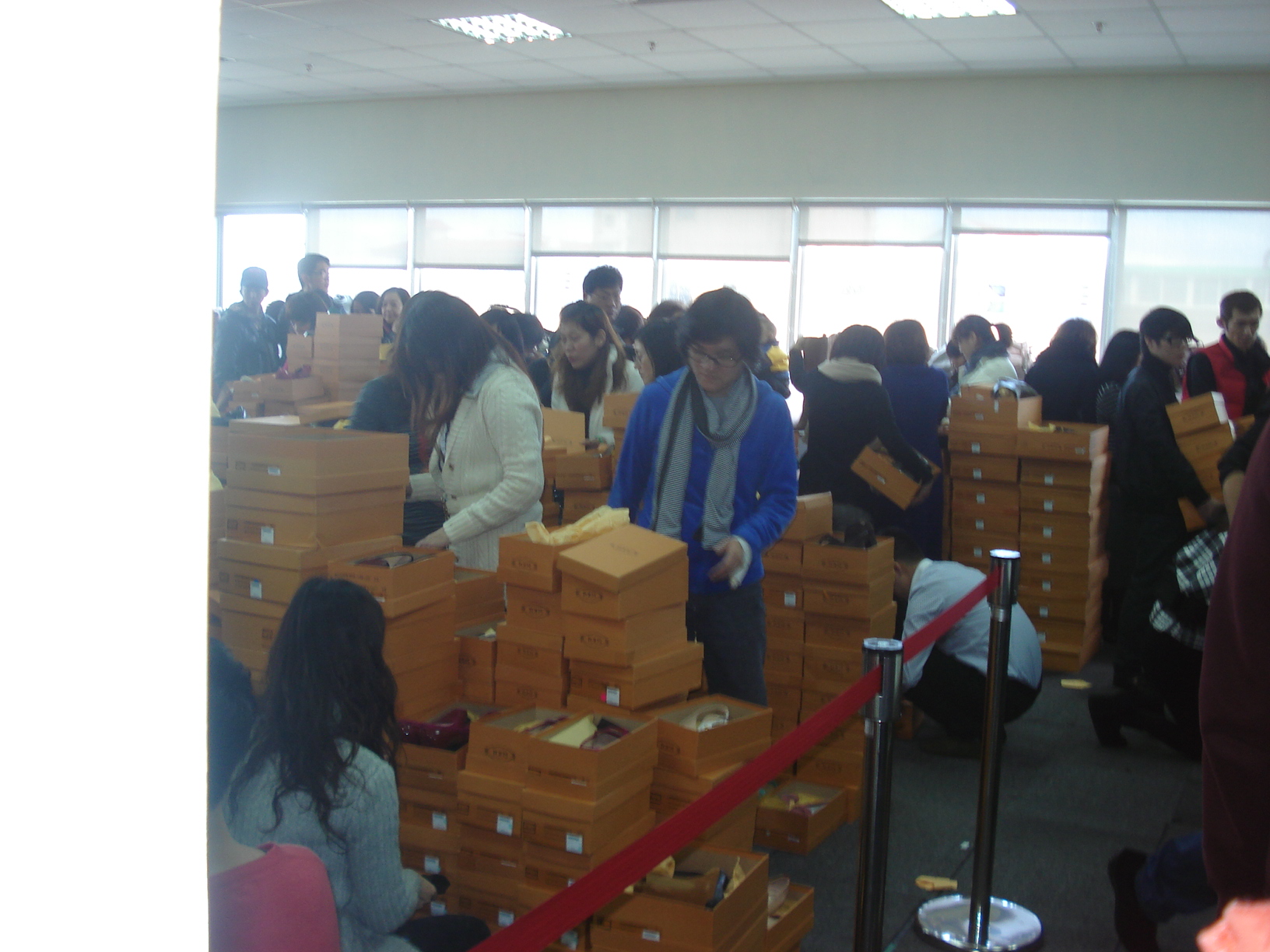 天呀!現場一片混亂,人山人海、成山成塔的鞋盒到處充斥,完全沒有名牌賣場舒適寬敞的環境,不過價錢卻是市價的50% to 80% off,鞋款應該是前兩年或上一季,一雙鞋折扣後大約US $ 120 至 $200。