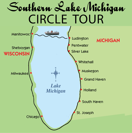 环密歇根湖游线路有很多种驾驶方式。选择从芝加哥出发北上取道密尔沃基再兜一大圈回到芝加哥是其中一个选择。但是更佳的驾驶线路是将整个环密歇根湖游分成南北两个部分。这样的选择既能节省体力又可以避免较为无聊的线路在几天内过多的重复,是一个进行环密歇根湖游的最佳方式。北密歇根湖的线路始于密歇根州的Ludington。在这里人们可以选择“快捷键”坐轮渡横跨密歇根湖直接到达对岸的Manitowoc,威斯康星。在这里人们可以欣赏到美丽的湖畔沙滩、灯塔和参加高尔夫课程。从Manitowoc出发沿着M-22向北就可以开始你的北密歇根湖之旅了。这沿线会经过威斯康星与密歇根州的大多数沿湖城市并欣赏秀丽的自然风光。最终这条北密歇根湖线路会结束在Ludington,也就是线路的起点,并完成了一个半圆的环湖游。南密歇根湖的线路同样始于威斯康星州的Manitowoc,并结束于密歇根州的Ludington。从Manitowoc出发沿着I-43公路向南首先到达密尔沃基,这是威斯康星州最大的城市,同时也闻名于它的酿酒厂。接下来顺着137公路并汇入US-41就达到了著名的风城芝加哥。芝加哥是整个环密歇根湖游线路上最大的城市,也是值得花最多时间停留的城市。在结束了芝加哥的游览后,绕过密歇根湖的南端就进入了印第安纳州和密歇根州南部。从这里开始,再经过了北印第安纳的“灰色”工业区以后又开始进入了风景优美的密歇根州游。沙滩、灯塔、森林、小镇又会成为了沿途的主要景观。这条南密歇根湖游最终会与北密歇根湖线路“会师”于密歇根州的Ludington,并画上了这个圆满的密歇根湖圆圈。