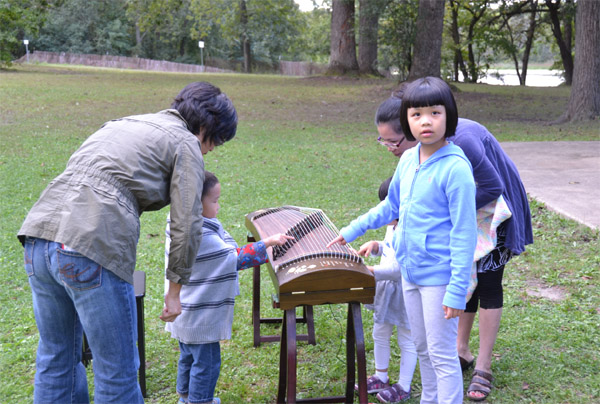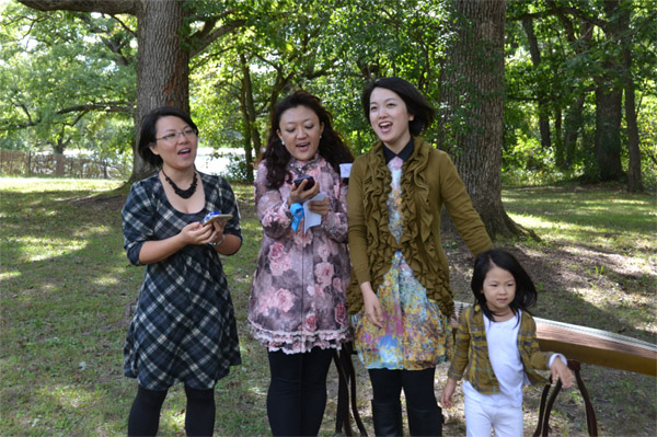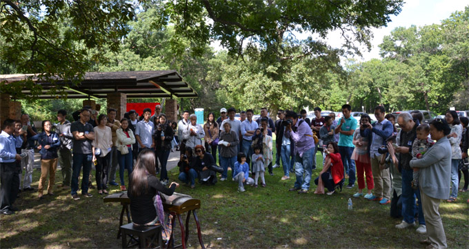 浙江大学校友会人才济济,曾在中央电视台青歌赛芝加哥赛区获得亚军的浙大校友何英,当天在静谧宜人的郊外公园为大家一展歌喉,悠扬的歌声吸引众多校友加入合唱。主办方还特别邀请到专业古筝表演家关孟华老师,在现场为演奏《茉莉花》、《高山流水》等古曲,公园绿草如茵、林木参天,悠扬的琴声令人陶醉。
