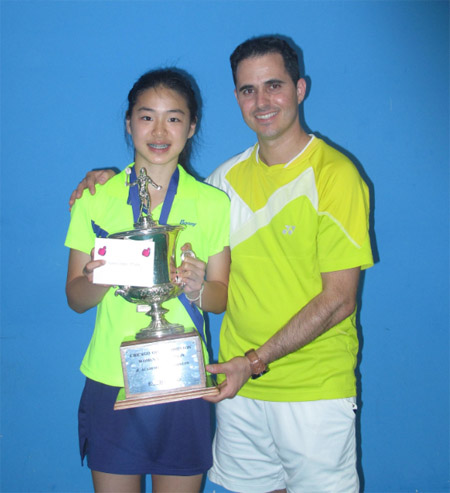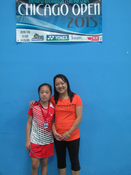 英雄出少年,年仅13岁的女单冠军Emma Lin与美中羽毛球俱乐部教练在赛后合影留念
