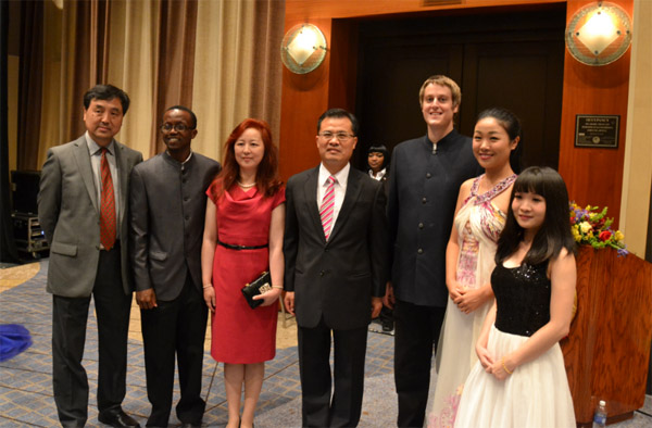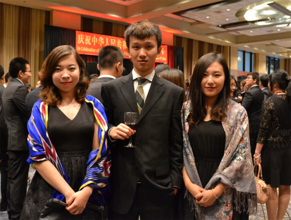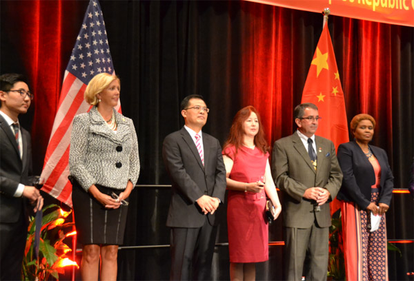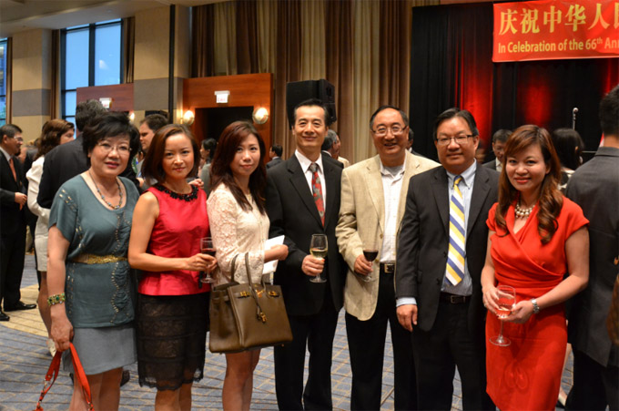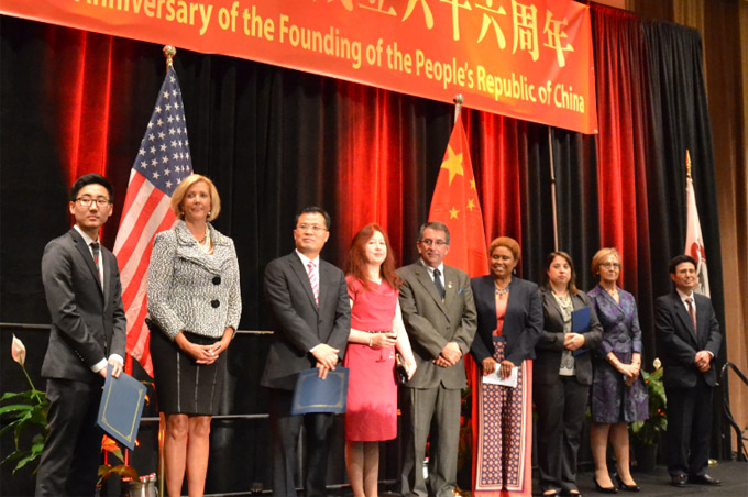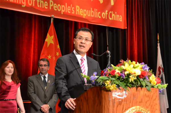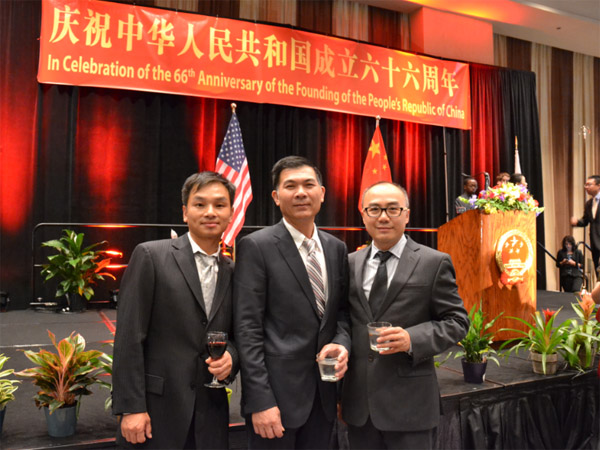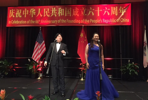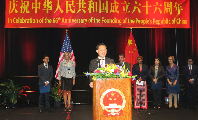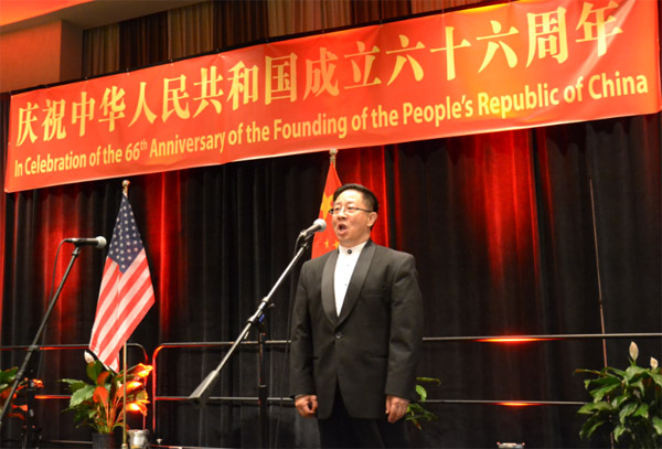 当天的招待会,由东方艺术团的成员们演唱中美两国国歌拉维帷幕。赵卫平总领事代表总领事馆对各界嘉宾的到来表示热烈欢迎,并感谢美国中西部地区华人华侨多年来为促进中美友谊所作出的杰出贡献。赵卫平表示,中国经济在今年复杂的国内外经济形势下保持了稳定的增长、经济结构升级不断加快。虽然经济下行压力依然巨大,但中国政府为此做好了准备。中国政府不仅拥有足够的政策工具,也将继续坚定地推行深化改革的宏伟计划。中国完全有信心保持长期中高速发展,并为中美两国在诸多领域的合作继续提供强劲动力。赵卫平总领事祝愿习近平主席此次访美取得圆满成功,中美两国不断繁荣、两国友好合作必将取得新的辉煌成绩!在当晚的招待会上,各界嘉宾也分别登台致辞,对中国即将迎来66周年国庆表示祝贺。