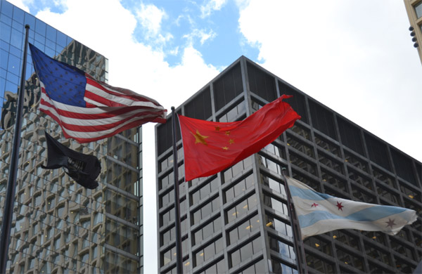 10月1日,芝加哥市中心升起五星红旗。芝加哥市将自己定位为“对华友好门户城市”