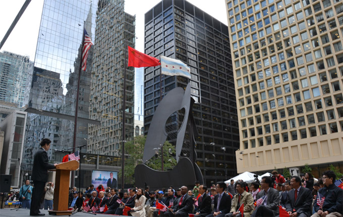 芝加哥侨学网报道】10月1日中国国庆66周年当天,大芝加哥华侨华人联合会(华联会)在芝加哥市中心戴利广场隆重升旗典礼,各界与会嘉宾见证红星红旗在这个特别的日子迎风飘扬,为祖国庆祝生日,同时也祝愿中美友好。