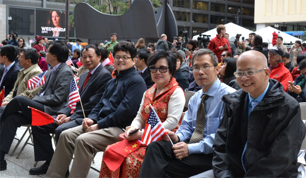 典礼当天,时逢市中心戴利广场农夫市场营业,各种生鲜蔬菜,秋日硕果摆满摊位,活动现场人流如织,升旗典礼吸引众多路人驻足。东方艺术团团长郑征主持当日活动,“声动芝加哥”歌手陈潇演唱美国国歌,现在所有人的注意力汇集在舞台。当一面鲜艳的五星红旗冉冉升起的时候,全场回荡雄壮的中国国歌。