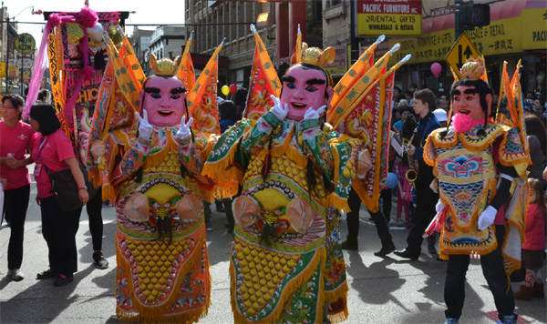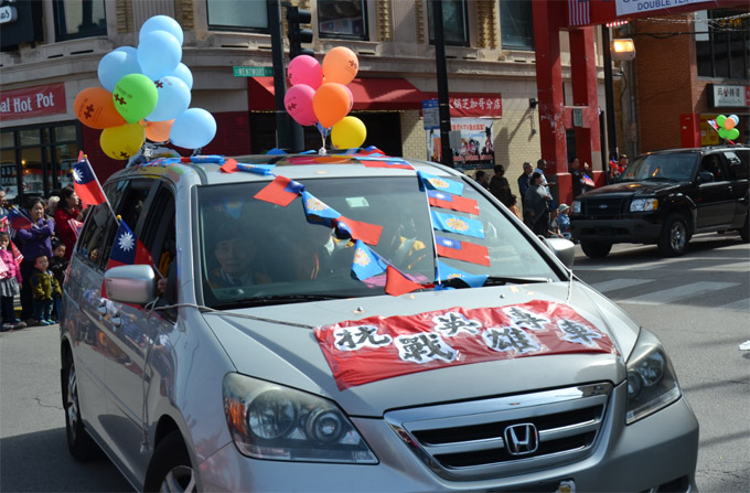 台北经文处、中华会馆、国民党美中支部、安良工商会,芝加哥台湾同乡联谊会、北一女校友会、成功大学校友会、中西部客家同乡会,侨学各界新年晚会、芝城华裔退伍军人会音乐社,芝加哥及美中地区各高校的台湾留学生联谊会等团体机构的花车、游行队伍,各具特色,吸引了大批的游人目光。伊州州务卿杰西怀特的跟斗队,当天也在天下为公牌楼前翻腾表演,引来阵阵喝采。当天最具人气的,当属电音三太子走秀,动感的音乐,搞怪的舞蹈,华丽而别具特色的传统服饰,沿途都是观众们拍照留念的焦点。