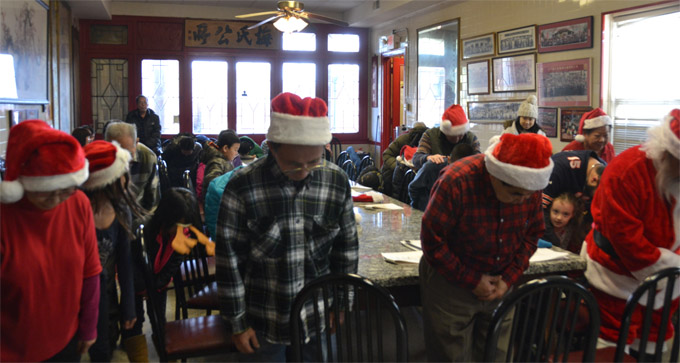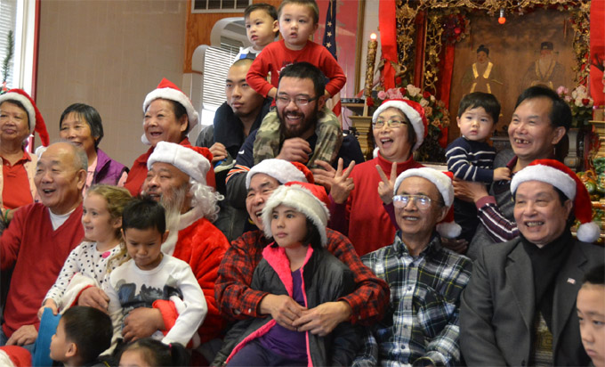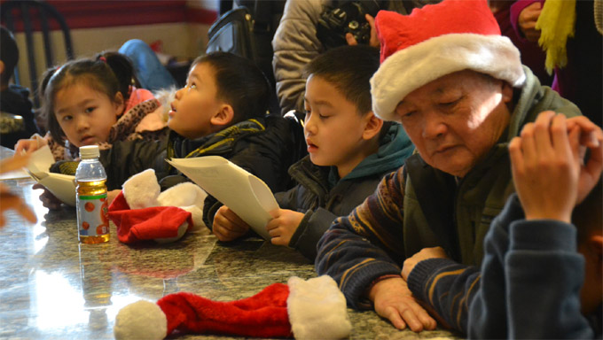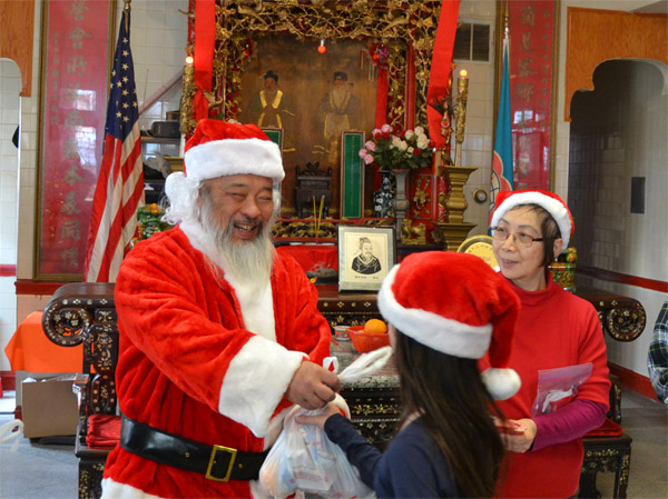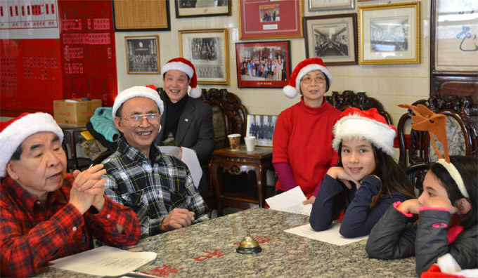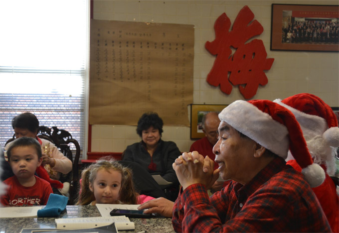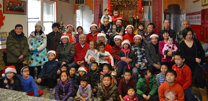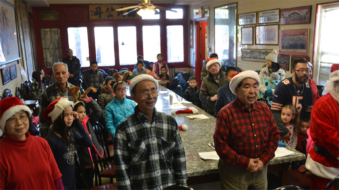 【芝加哥侨学网报道】老少三代头戴圣诞帽,用英文欢唱圣诞歌曲,向先祖神像与灵位三鞠躬,派发节日利是红包,还有麦当劳礼品卡,这样中西文化融合的节庆活动,在芝加哥梅氏总公所的圣诞联欢上呈现。梅氏宗长们用英文向已经不怎么讲中文的华裔后代们叮嘱,不要忘根,长大后也要常来梅氏公所看看。