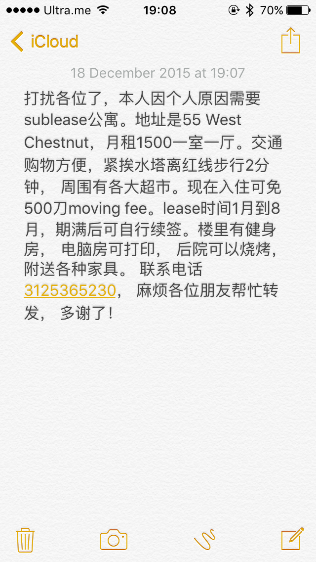 打扰各位了,本人因个人原因需要sublease公寓。地址是55 West Chestnut,月租1500一室一厅。交通购物方便,紧挨水塔离红线步行2分钟, 周围有各大超市。现在入住可免500刀moving fee。lease时间1月到8月,期满后可自行续签。楼里有健身房, 电脑房可打印, 后院可以烧烤,附送各种家具。 联系电话3125365230, 麻烦各位朋友帮忙转发, 多谢了!