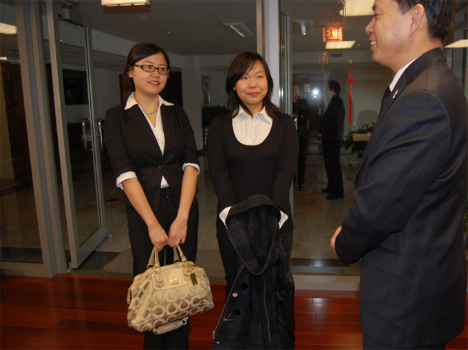 中国驻芝加哥总领事馆副总领事卢坤与两位女博士在领馆教育组亲切交谈,左一为获得2010年中国国家优秀自费留学生奖学金的女博士陈佳未,来自 Washington Univerisity at St. Louis 。这位女博士被本网网友评定为美女级博士,本斑竹评定为时尚女博士,她的穿着不仅专业、得体,而且手里的包包经初步鉴定是很值钱的,只是本斑竹分不清到底是Gucci 还是Coach就是了