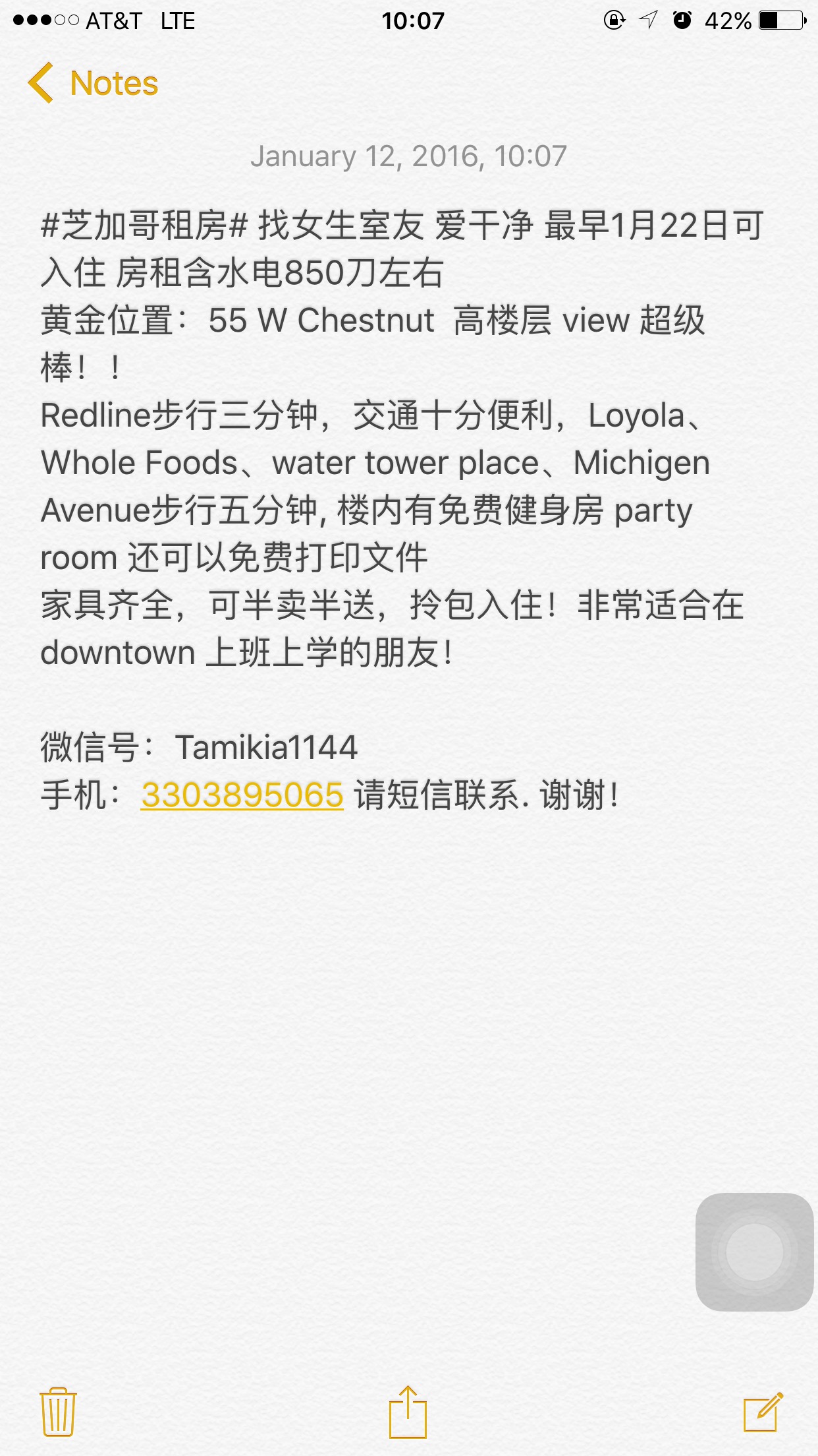找女生室友 爱干净 1月22日可入住,预算850刀,家具集全,半卖半送,拎包入住 55 W Chestnut Redline就在家门口,Loyola、Whole Foods、Michigen Avenue步行五分钟, view很好 楼内有健身房 打印 微信号:Tamikia1144 手机:330-389-5065(perfer 短信)