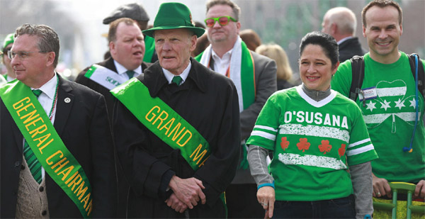 在河水染绿之后,欢乐才刚刚开始,一年一度的圣派特里克节在市中心格兰特公园举行。包括伊利诺伊州长朗纳(Bruce Rauner),芝加哥市长伊曼纽尔(Rahm Emanuel)、伊州议会议长迈克麦迪根(Michael Madigan)这些伊州政坛重量级人物都参加,他们身着绿色元素的服装列成一队,在哥伦比亚大道(Columbus Drive)加入庆祝游行的队伍,并亲切问候两边围观游行队伍的市民。