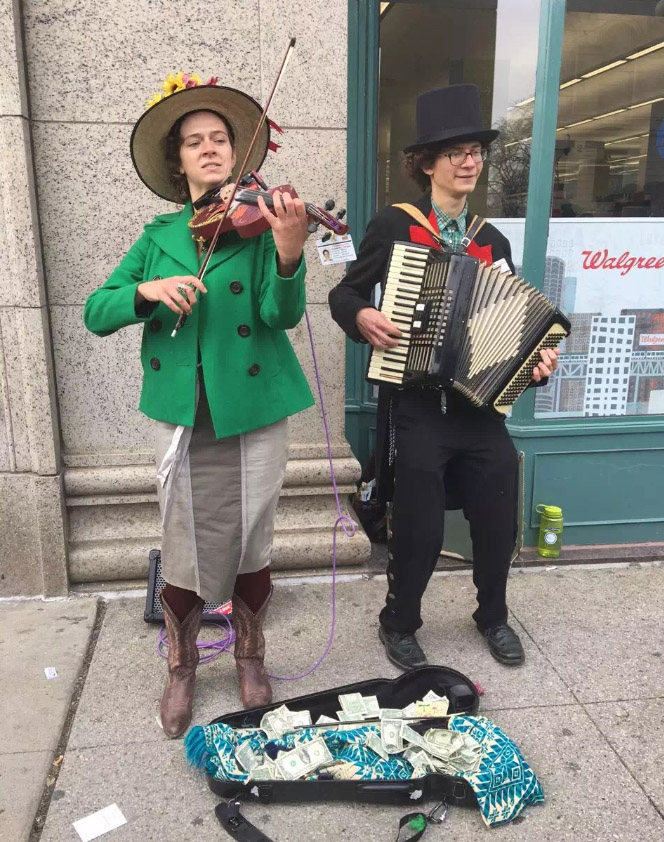 就连街头卖艺者,都有绿色服饰
