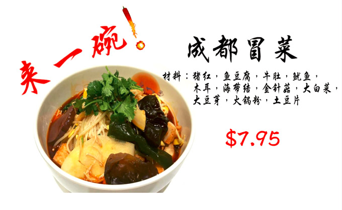“冒菜”是成都的特色菜,虽然被称为菜,但里面内容可是大有讲究。所谓冒菜,就是把豆芽,藕片,豆腐青菜等放在一个用竹编的帽子里,然后放在一锅辣的老汤里煮,出锅后撒上调料就可以吃啦。虽然是川菜,但是麻中不辣,健脾健胃,不上火。