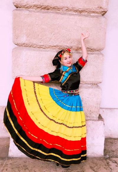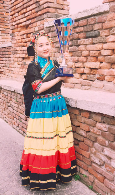 王一,女,国内师范大学音乐系毕业,今年年初刚刚加入芝加哥华人艺术团,成为团里年龄最小的成员。这次意大利之行不仅为团队选择了让人眼前一亮的服装,并且在演出中负责女中音及领唱,其专业演出水准还受到了评委会主席Giorgio Croci的赞扬