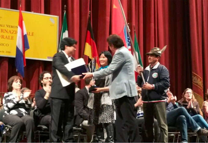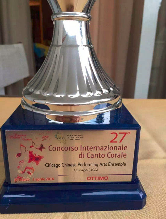 【芝加哥侨学网报道】在刚结束的 (3/30/2015 - 4/2/2016) 意大利维罗纳第27届国际合唱节暨合唱比赛中,芝加哥华人艺术团与密歇根华人合唱团共襄盛举在12个国家、共22个参赛合唱队中脱颖而出获得成人组混声合唱第一名荣获金奖!这是中国人第一次在意大利维罗纳国际合唱节中获得金奖第一名!这是芝加哥华人艺术团与Paul Wu、姜旸带领的密歇根华人合唱团团员共同努力的成果!