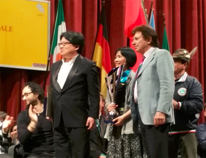 当芝加哥华人艺术团团长谭小敏与艺术指导童韬从评委会主席Giorgio Croci接过硕大的蓝色奖杯时,全场欢呼雀跃,应合唱节组委会主席邀请童幍激动地唱起《我的太阳》,迎来全场经久不息的掌声!