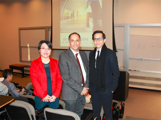 “绿卡快车校园行”主讲人罗子凯律师(右),EB-5项目负责人Scott David Greenberg(中),贾娟女士(左)