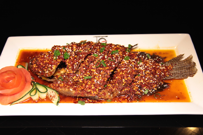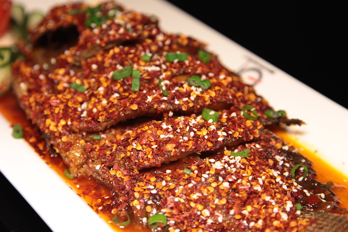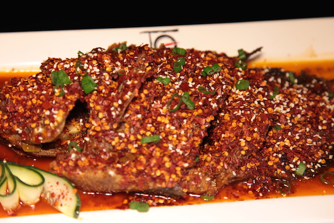 这道菜选自鲜活的红立鱼(RedSnapper),特别处理干净后切花刀,再经独门腌制,下油锅快炸,将鱼的肉汁紧紧锁住达到外焦里嫩的效果。辅料选用正宗川菜才使用的二荆条辣椒原料以及四川汉源青花椒,配以花生一齐打磨后炝炒出独有香辣味。再将红辣辣的料覆盖整条鱼身,从外观就凸显了辣辣辣的主题,使得这道菜拥有了咸鲜麻辣脆的独特口感,而且这鱼本身少刺,所以说吃起来也是满口的幸福。