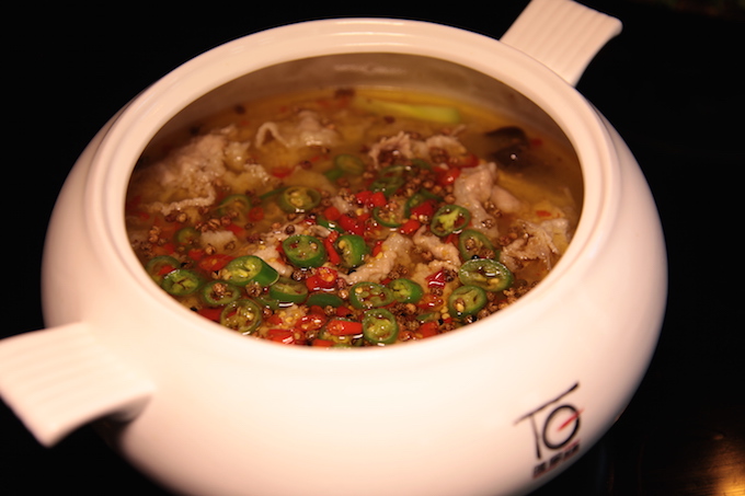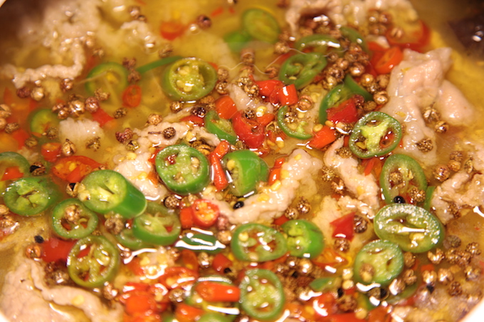 红红绿绿的小米椒映入眼帘,四川汉源的青花椒相伴左右,肉是选用上等肥牛,经过24个小时清水冲洗,达到去血腥,保鲜嫩的效果。把小米椒等佐料爆炒后加以芽菜粉丝和高汤熬制,最后加入肥牛,起锅前再淋上汉源青花椒油。一锅下来这肉是口感香嫩,汤是清儿不浊,汤底配有芽菜和粉丝也是入味三分。