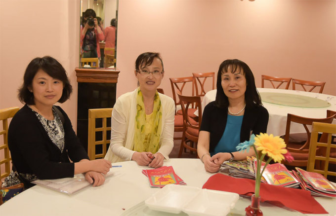 新任会长李咏梅(中)与名誉会长、大芝加哥著名华裔女企业家毕跃玲(右)
