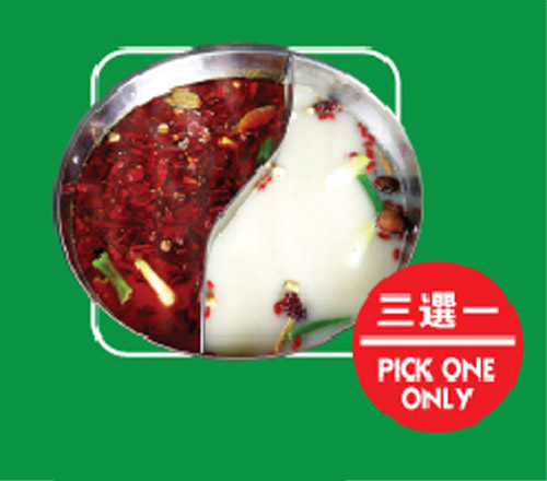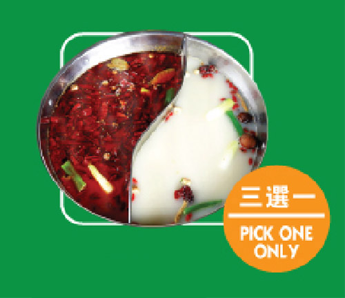 汤底:秘制麻辣锅、秘制原味锅、秘制鸳鸯锅,三选一