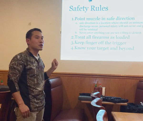 在当天讲座上,大芝加哥地区枪友会负责人王军为大家讲解了安全使用枪支的相关守则,包括非紧急情况下枪口不可指向任何人,任何时候都假定枪支处在子弹上膛的状态、在准备射击之前手指避免接触枪支扳机、郊外打猎需要考虑目标后面的情况等。另一位主讲人Randal则着重介绍了遇到危险时处理的原则和方法,同时介绍了很多现实中发生的危险处理实例。